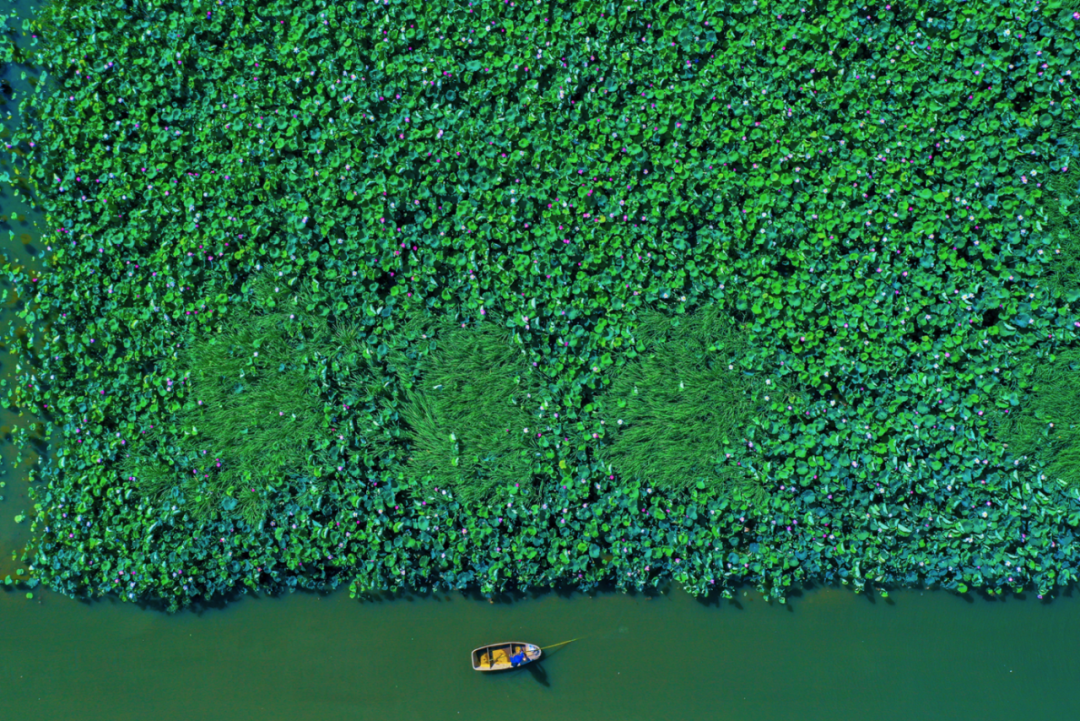 说明:接天莲叶无穷碧,生态旅游在洪湖。泛舟于绿意盎然之中,无比惬意。