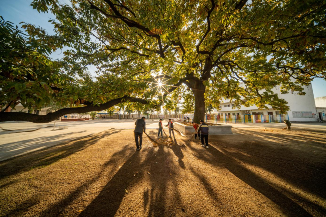 说明:老师带领学生树下劳动,保护环境,美景如画,令人动容。美丽中国,我是行动者。