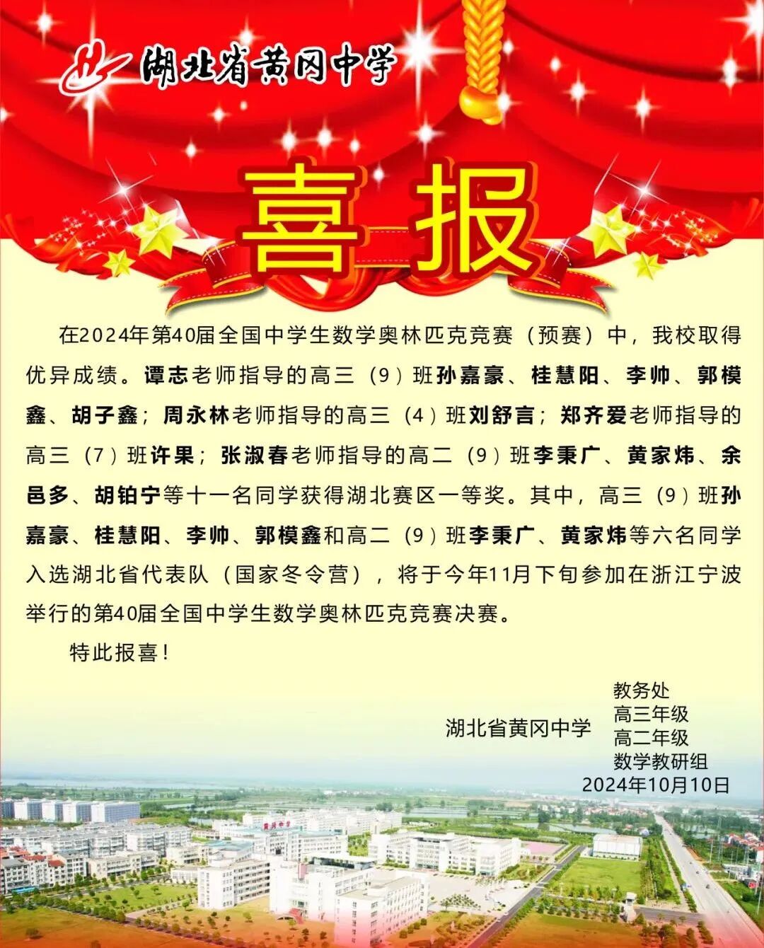 在2024年第40届全国中学生数学奥林匹克竞赛(预赛)中,黄冈中学11名同学获得湖北赛区一等奖,6名同学入选湖北省代表队(国家冬令营),将于今年11月下旬参加在浙江宁波举行的第40届全国中学生数学奥林匹克竞赛决赛。