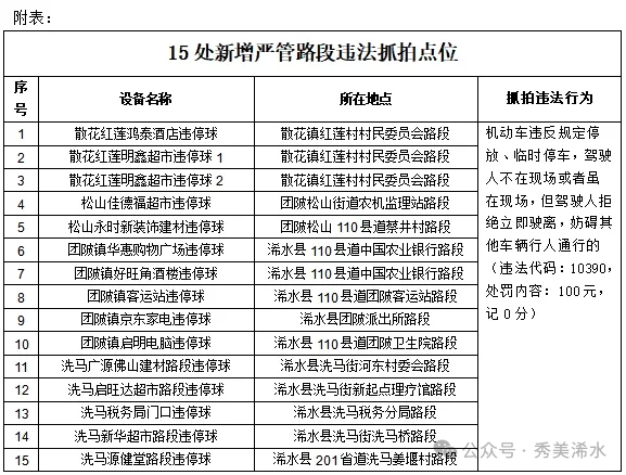 10月16日起,浠水县将启用15处新增违停抓拍电子警察设备,抓拍时间:7:00——20:00。