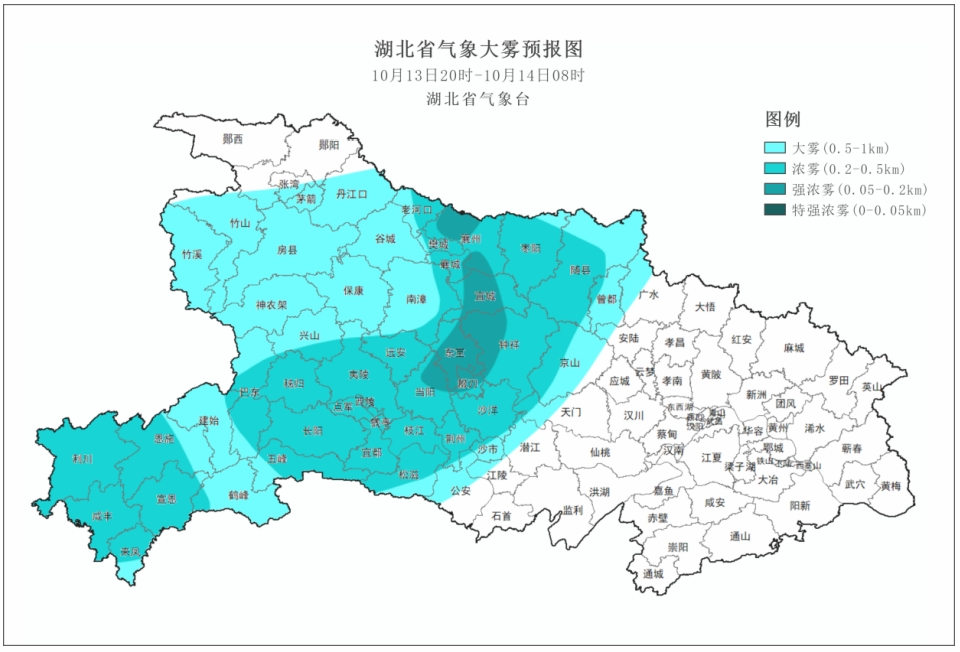 大雾黄色预警预计10月13日夜间至10月14日早晨,襄阳、随州、荆门、宜昌、恩施、荆州西部等部分地区将出现能见度小于500米、局地小于200米的雾,请注意防范。