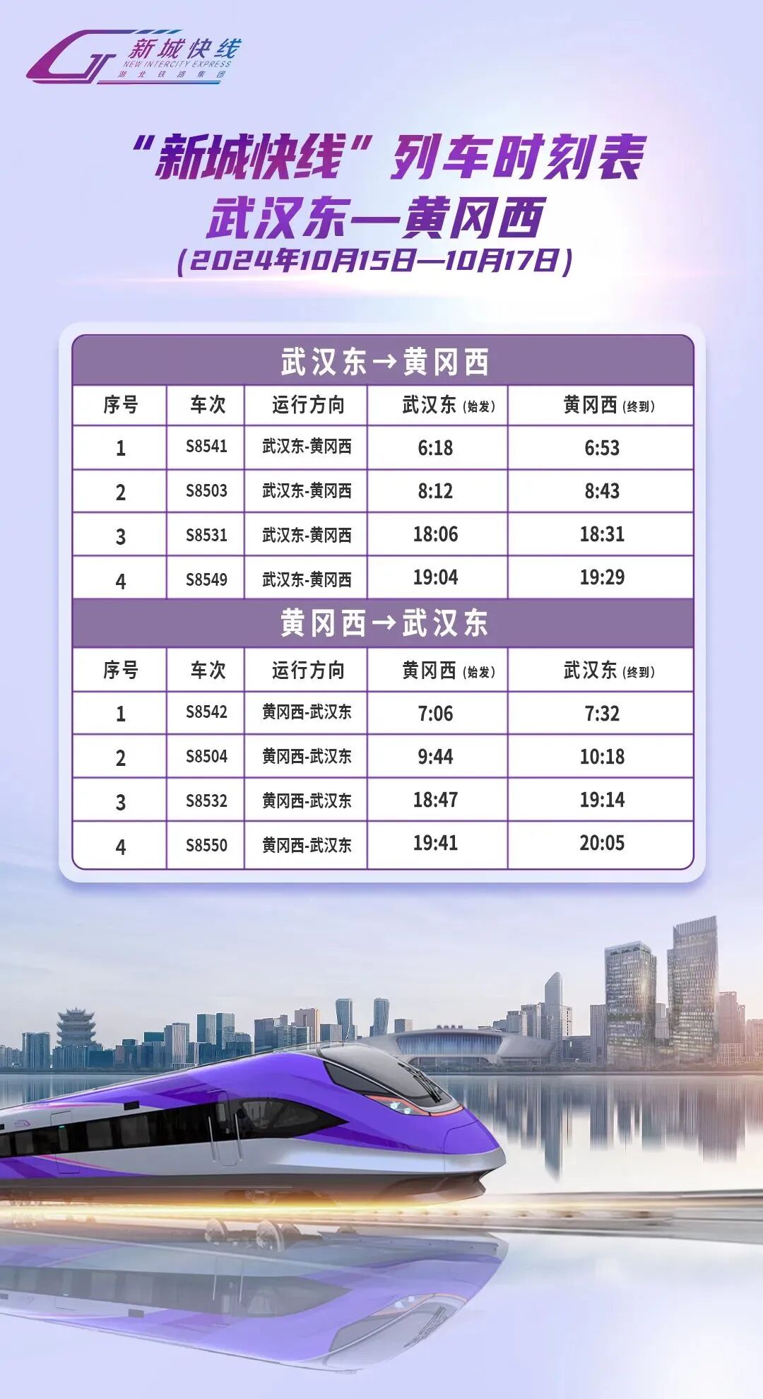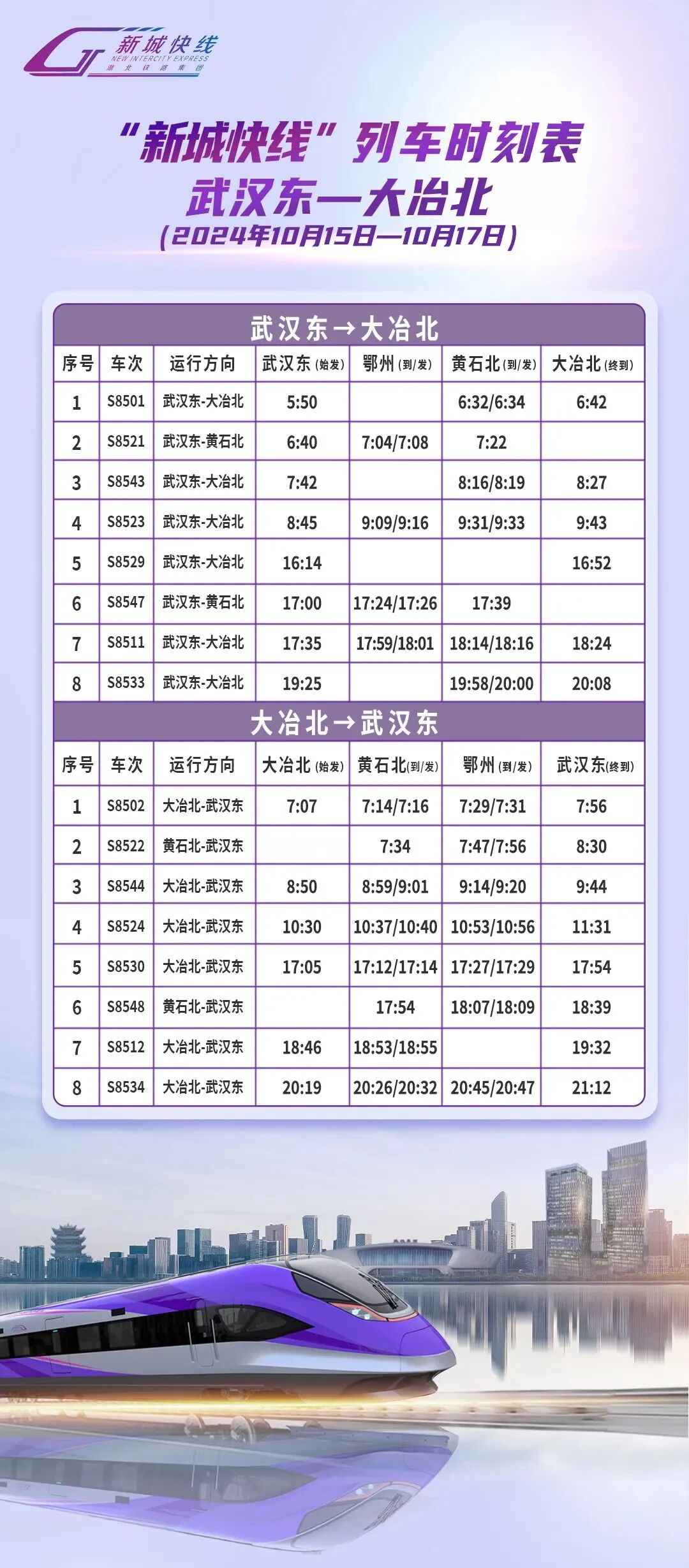 湖北铁路集团轨道运营有限公司发布公告,10月15日至17日,武汉东→黄冈西S8525次、S8527次、S8509次;黄冈西→武汉东S8526次、S8528次、S8510次列车;武汉东→大冶北S8505次、S8507次;大冶北→武汉东S8506次、S8508次临时停运。