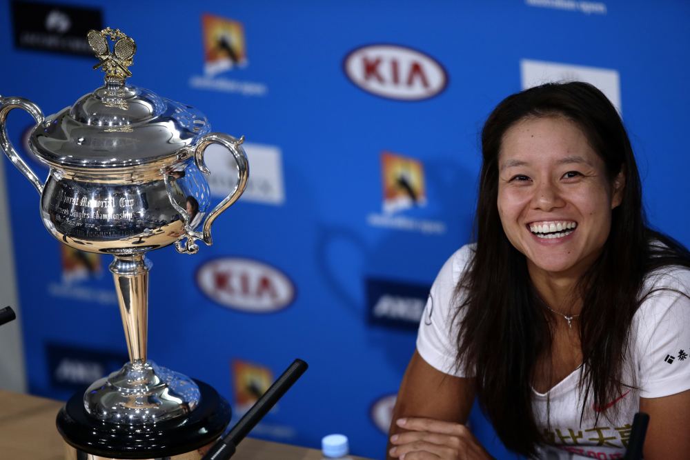 2014年1月25日,在墨尔本公园进行的2014澳大利亚网球公开赛女单决赛中,中国选手李娜2:0战胜斯洛伐克选手齐布尔科娃,夺得冠军。图为李娜出席赛后新闻发布会。