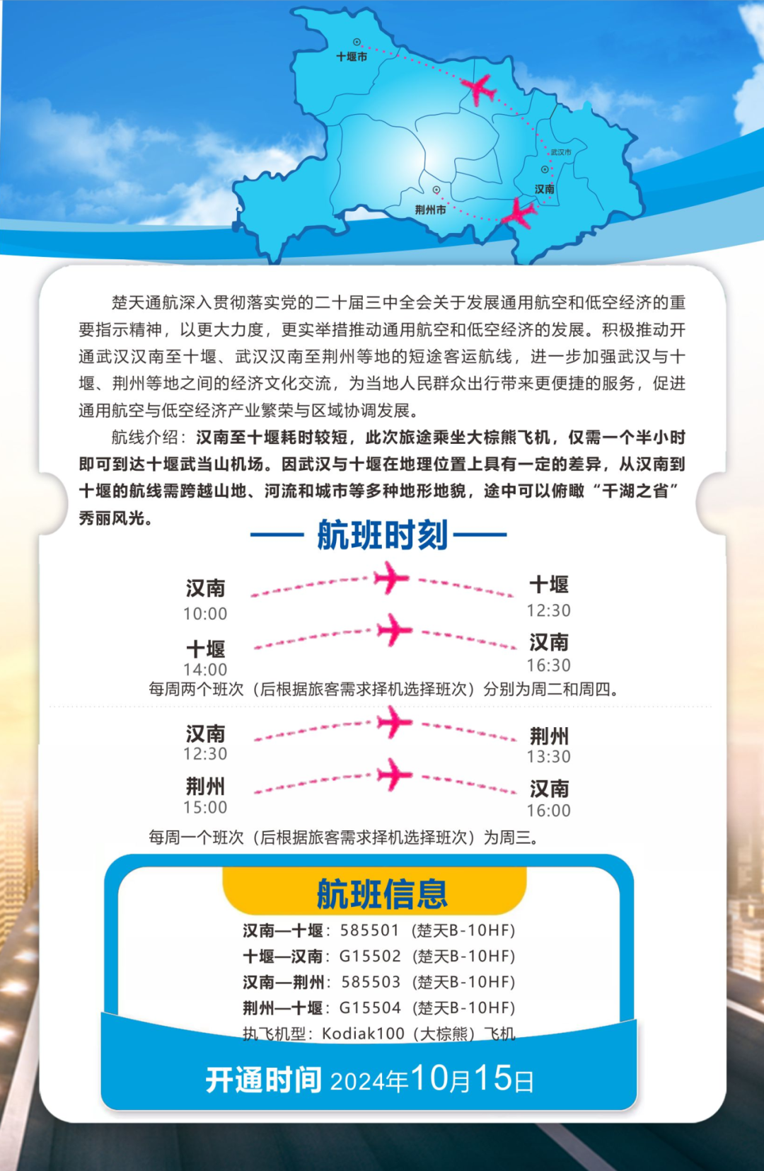 目前,汉南⾄⼗堰航线每周两个班次,周⼆与周四执⻜,汉南机场10点起⻜,12点30分抵达⼗堰武当⼭机场;返程航班14点从十堰起⻜,16点30分抵达武汉汉南机场,空中飞行时间约1小时45分钟。汉南⾄荆州航线每周三执⻜,中午12点30分从武汉汉南机场准时起⻜,13点30分抵达荆州沙市机场;返程航班15点起⻜,16点抵达汉南,空中飞行时间约45分钟。