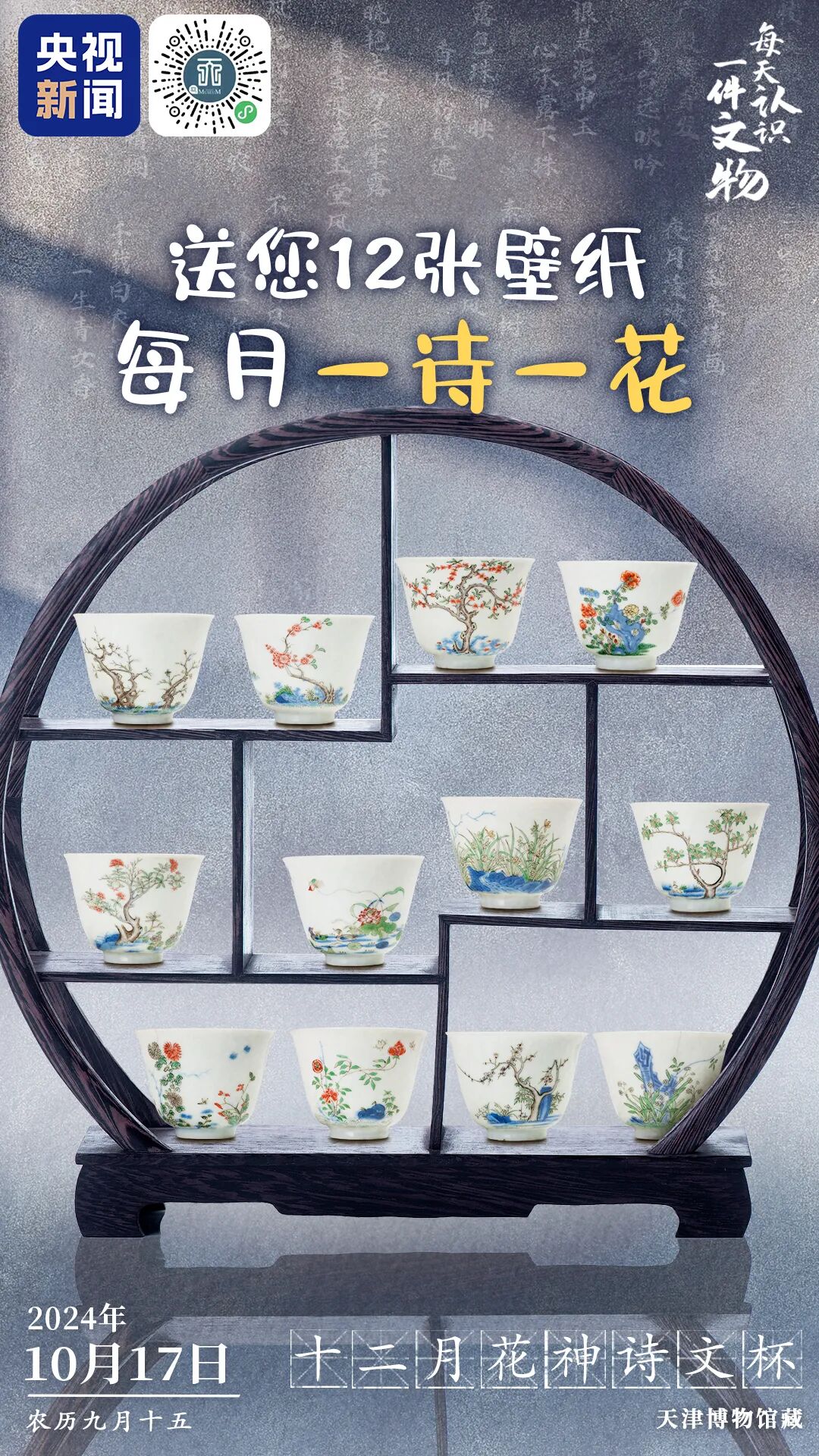一月一杯,一杯一花;一花一诗,一诗一印。这是清代康熙年间的一套珍贵瓷器,十二月花神诗文杯。花神杯每十二件为一套,杯身绘有十二月令花卉,腹壁一面绘花,一面题诗,诗末以方形篆书落“赏”字印。它将绘画、诗词、书法、篆印完美结合,是康熙朝官窑瓷器中的瑰宝。