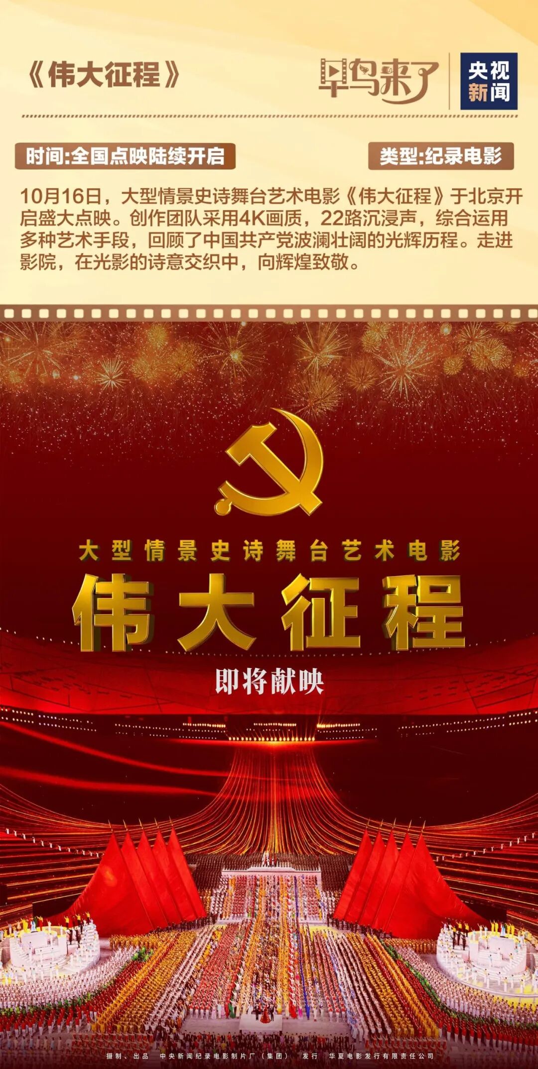 16日,大型情景史诗舞台艺术电影《伟大征程》于北京开启点映!为充分利用巨幕影院的放映效果,创作团队采用4K画质,22路沉浸声,综合运用多种艺术手段,全景式回顾了中国共产党波澜壮阔的光辉历程。走进影院,在诗意的光影交织中,在震撼的视听体验中,为伟大的民族复兴放歌。