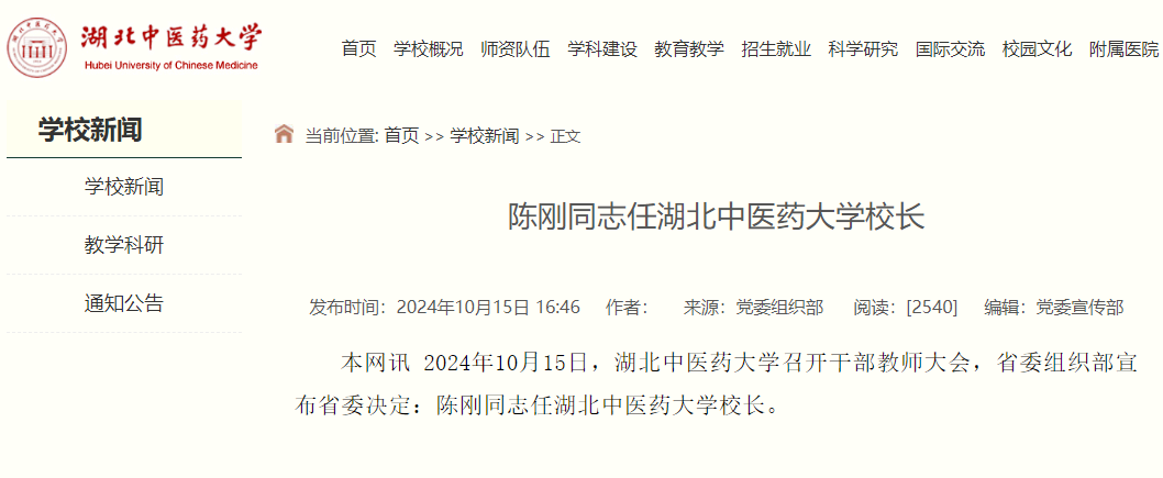 据湖北中医药大学官网消息,10月15日,湖北中医药大学召开干部教师大会,省委组织部宣布省委决定:陈刚同志任湖北中医药大学校长。