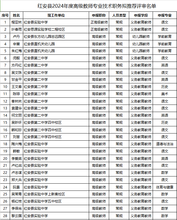 经红安县职称改革工作领导小组办公室初审,现将红安县2024年度中小学教师系列专业技术职务评审人员名单公告如下:
