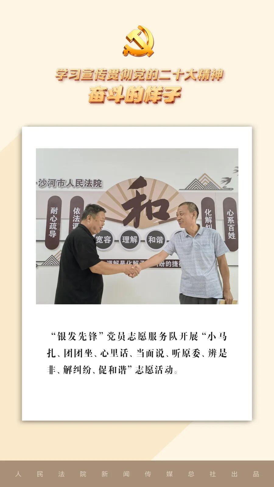 党的二十大报告把“做好离退休干部工作”放在了“坚定不移全面从严治党,深入推进新时代党的建设新的伟大工程”中谋划部署。河北省沙河市人民法院坚持和发展新时代“枫桥经验”,引导老同志在基层治理、党建等多领域更好发挥作用,组织“银发先锋”党员志愿服务队,共绘法治沙河美好蓝图。