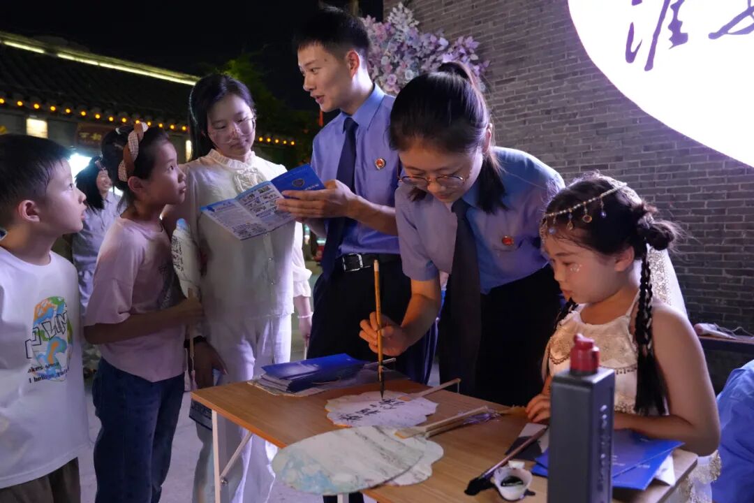 今年暑假,淮安市淮安区检察院在河下古镇开展“‘漆’彩法治夜市”普法活动,为小朋友们讲解暑期安全防护知识。