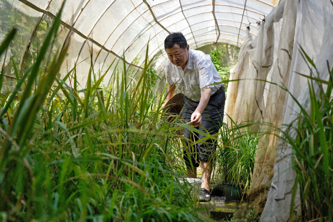 赤脚的何光存教授在田埂上查看水稻苗情誓要把粮食从虫口夺回来。从上世纪90年代开始,武汉大学教授何光存背着瓶瓶罐罐深入田间捕捉褐飞虱,并开始在纱网棚内大量养殖褐飞虱,测试各种水稻对褐飞虱的抵抗能力,成为一名默默耕耘的“养虫人”。2009年,何光存带领科研课题组终于克隆出国际上第一个水稻抗褐飞虱基因,使褐飞虱吸食不到水稻汁液,显著提升水稻对褐飞虱的“反抗能力”。单靠一种“抗虫基因”还不足以建立褐飞虱防火墙,何光存课题组经过20余年研究,从野生稻和古老农家水稻品种中又陆续克隆出10个抗褐飞虱基因。目前,各国科学家已克隆出17个抗褐飞虱基因,何光存课题组拥有其中的11个,推动我国抗褐飞虱研究跃居世界领先行列。