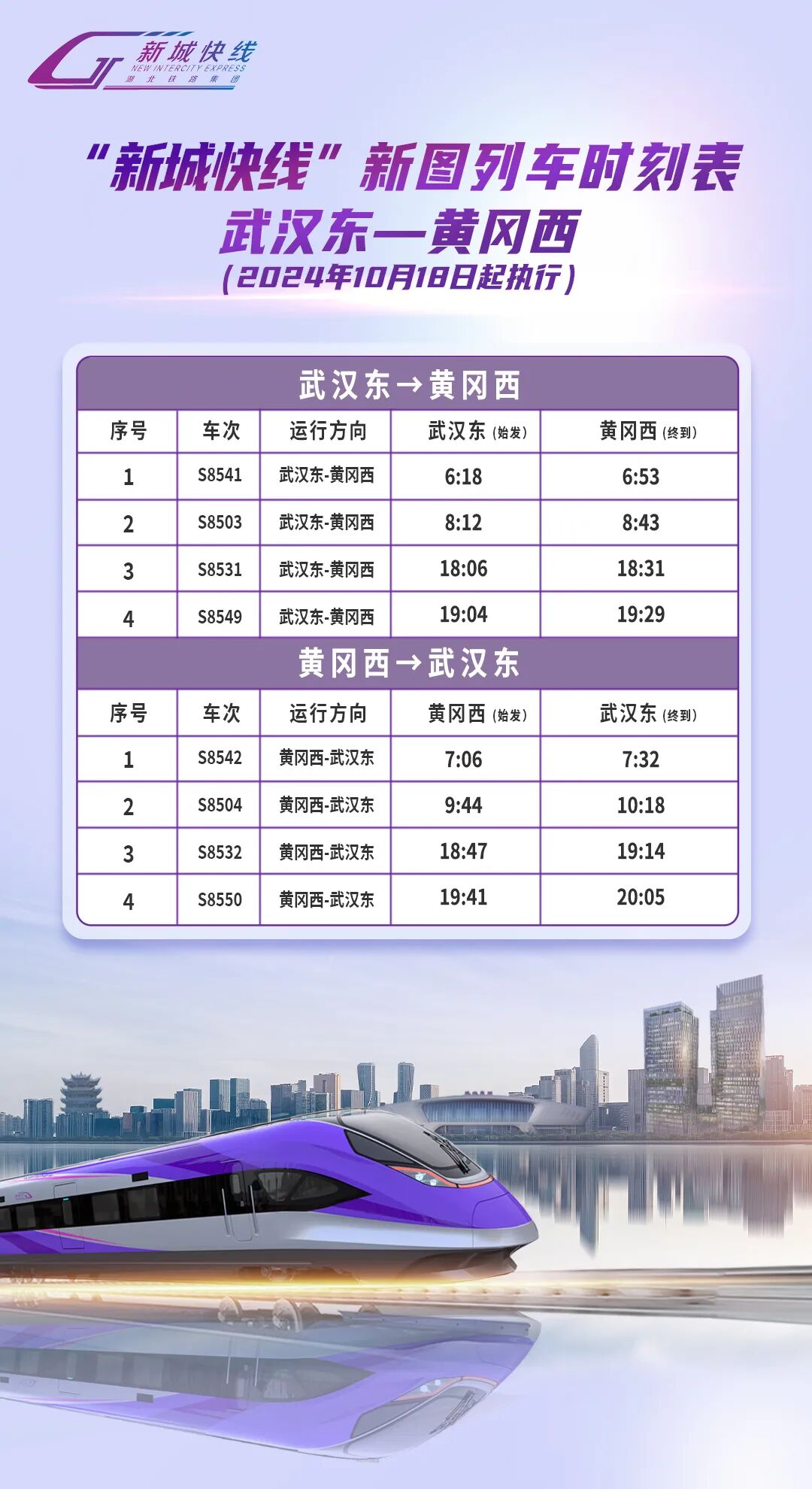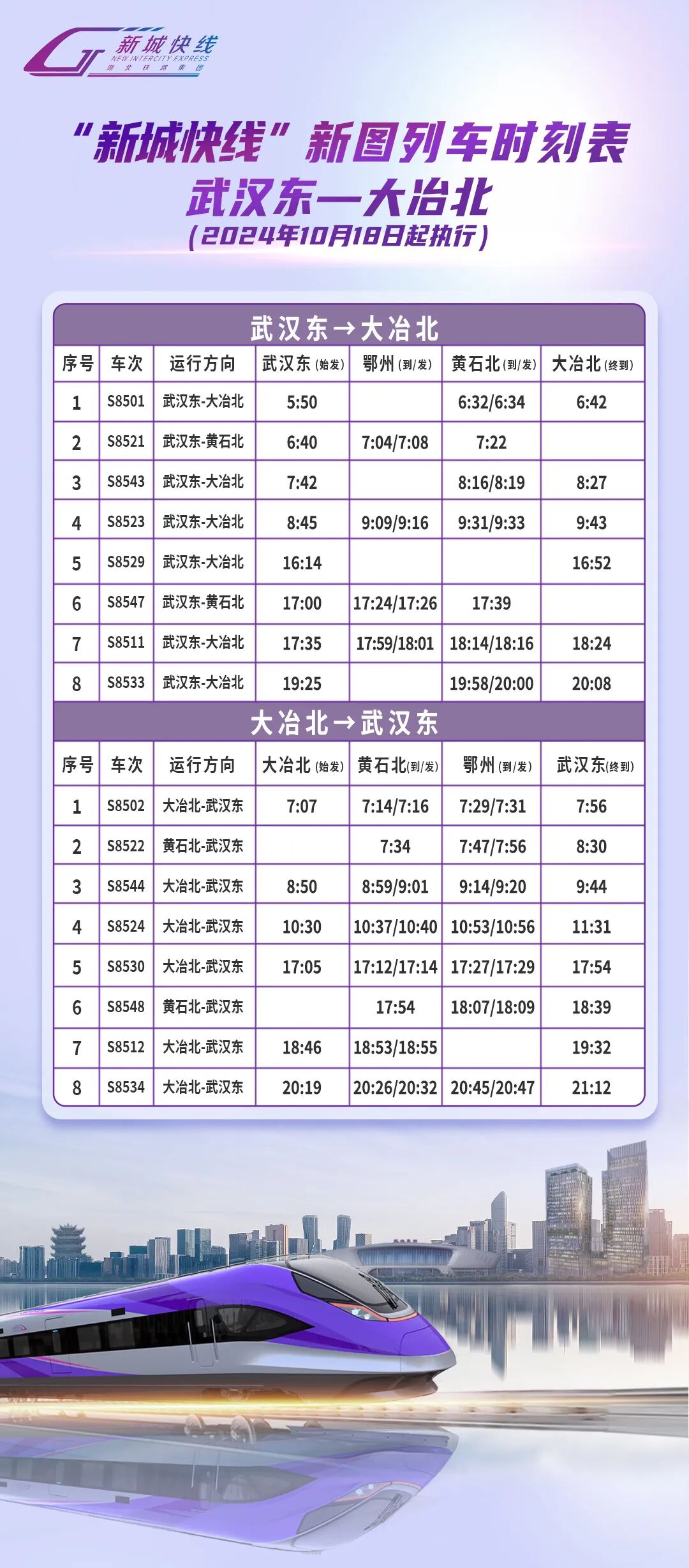 10月18日零时起“新城快线”调整运行图,列车日常开行执行同一张运行图。请大家出行前及时查看“湖北铁路集团轨道运营有限公司”微信公众号或支付宝、微信“新城快线乘车码”小程序中的最新列车时刻表,提前规划行程,祝您旅途愉快!