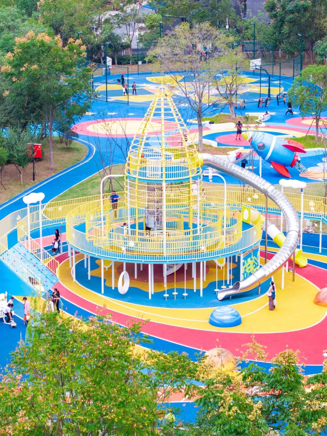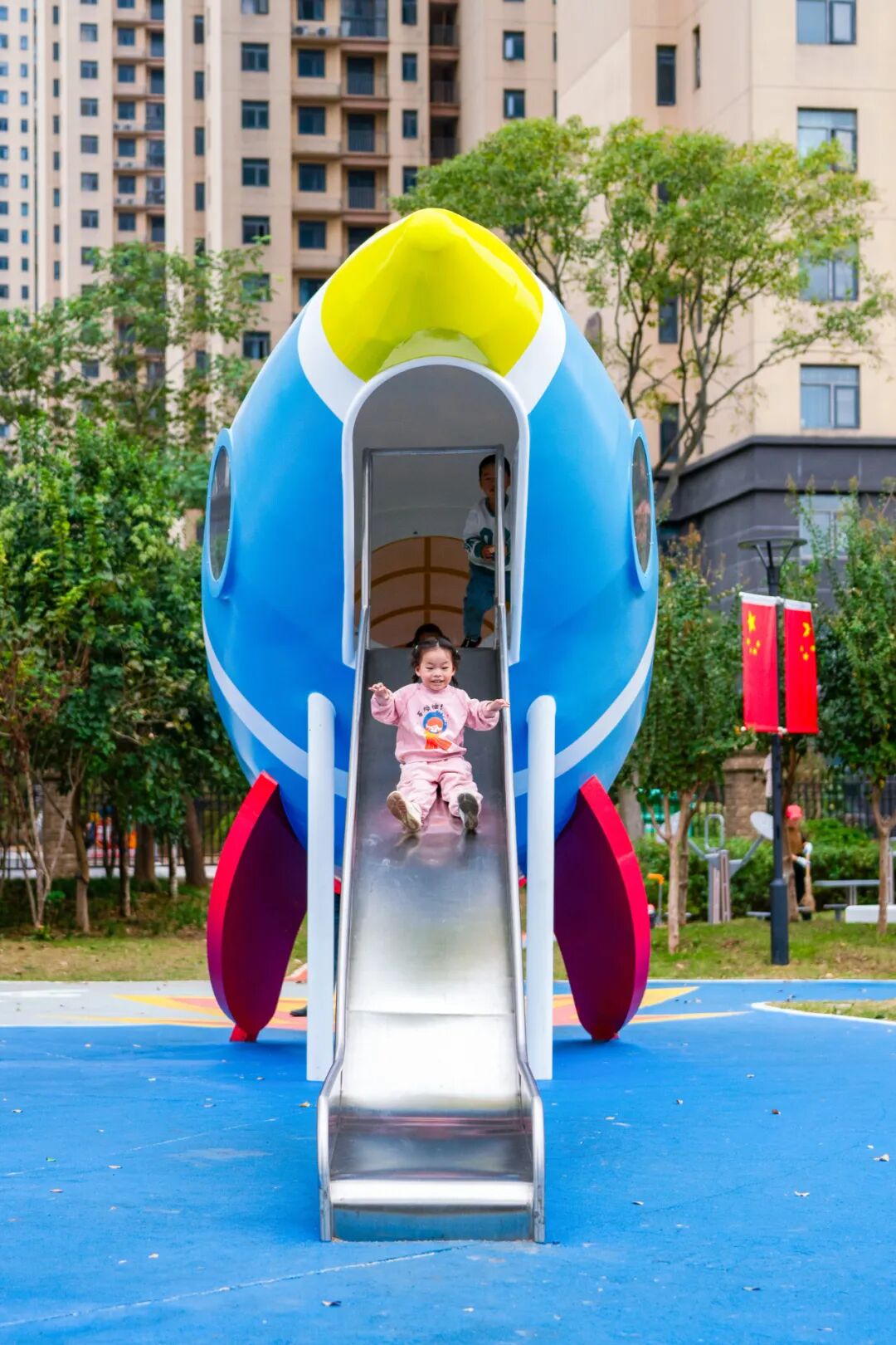 最亮眼的景观设施,是一枚高11米、底径6.9米,矗立地面,蓄势待发的“运载火箭”。“火箭”同时具有高滑梯、秋千等游乐功能。