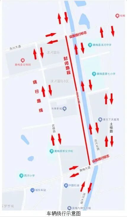 从2024年10月17日至2025年1月10日,黄梅县滨河西路(黄梅大道西河桥头至永兴大道-桥头路段)实施双向全封闭管控,所有通行车辆和行人可从永兴大道至武穆路至黄梅大道绕行;从一桥至滨河东路或土桂公路绕行。