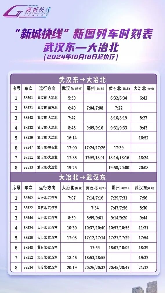 10月17日,湖北铁路集团轨道运营有限公司发布公告,10月18日零时起,“新城快线”调整运行图,列车日常开行执行同一张运行图。