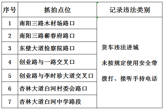 自10月20日起,在蕲春县漕河城区周边重点路口新增一批电子警察抓拍设备,对驾驶时拨打、接听手持电话,驾驶人未按规定使用安全带,货车违法进城等违法行为进行自动抓拍处理。