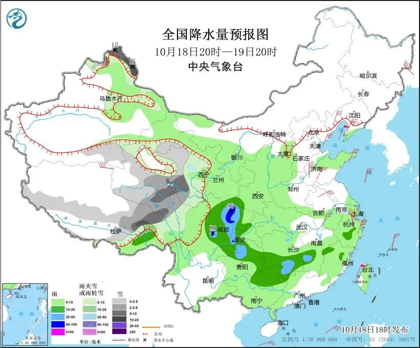 中央气象台预计,10月18日20时至19日20时,新疆北疆北部和东部、西藏中部和东部、西北地区中部等地部分地区有小雪或雨夹雪,其中新疆北疆北部、西藏东北部、青海东部和南部、川西高原北部等地部分地区有中到大雪,新疆北疆东部、西藏东北部等地局地暴雪。西藏东南部、四川盆地大部、重庆西南部、贵州北部、广西北部、湖南南部、江西中西部等地部分地区有中到大雨,其中,四川盆地西部和北部等地部分地区有暴雨。