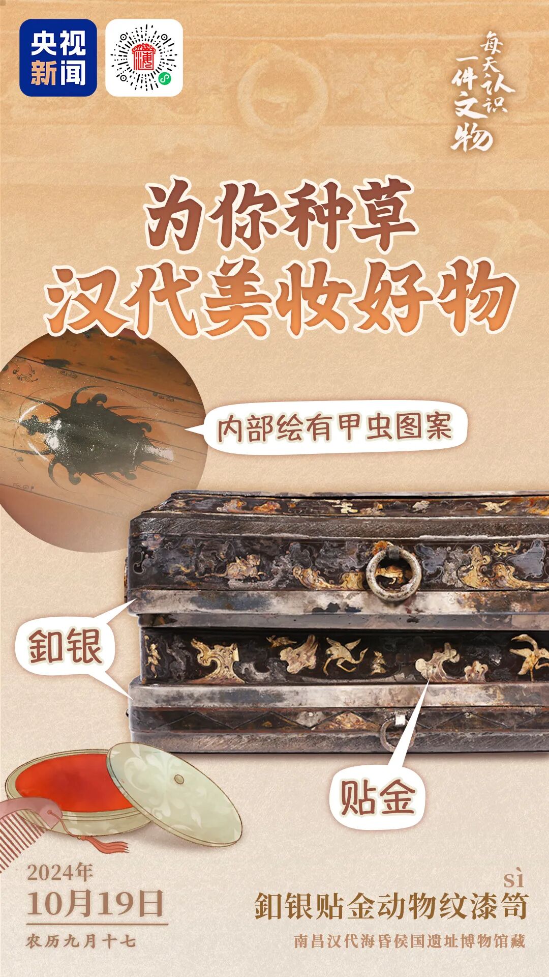 央视新闻联合全国博物馆推出文博科普产品《文博日历》,每天带你认识一件文物。釦(kòu)银贴⾦动物纹漆笥(sì)现藏于南昌汉代海昏侯国遗址博物馆,是⻄汉海昏侯刘贺的化妆盒。盒子由委⻆式器⾝和盝(lù)顶式盖两部分组成,用于收纳梳篦、脂粉等小物件。它集夹纻、彩绘、釦银、贴⾦等众多漆器⼯艺于⼀体,代表了⻄汉漆器制作的巅峰⽔平。长按识别图中小程序查看详情↓