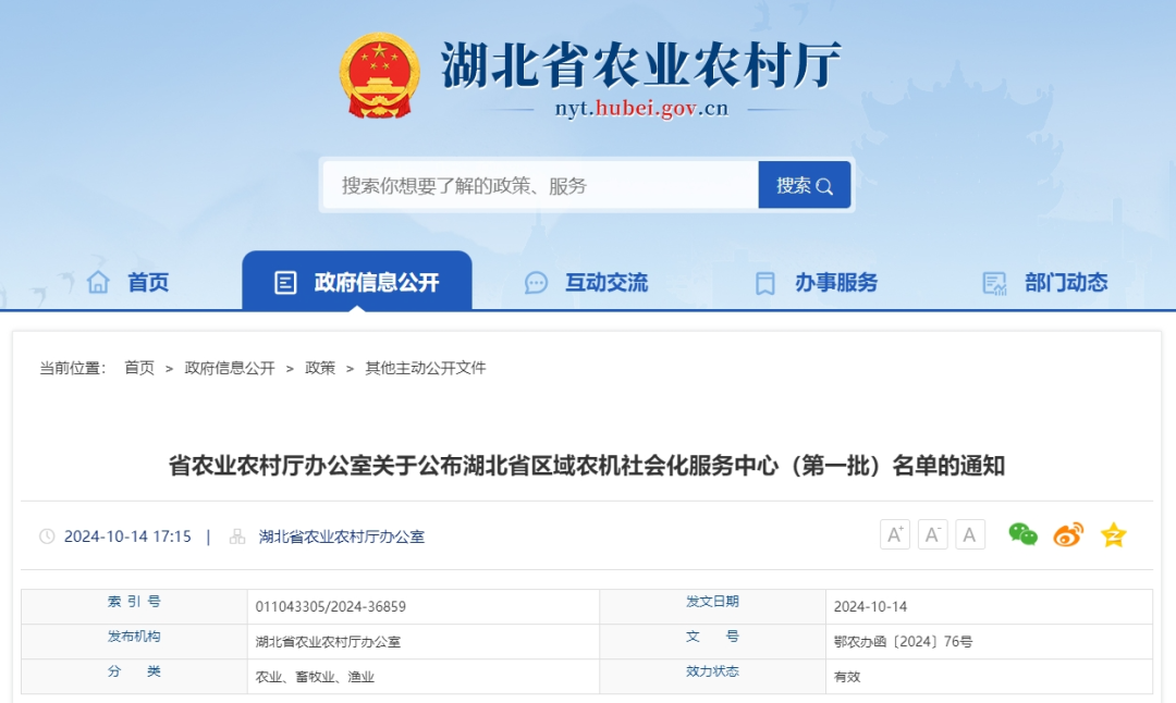根据《农业农村部关于加快培育区域农机服务中心的指导意见》(农办机〔2023〕2号)、《省农业农村厅办公室关于印发湖北省区域农机社会化服务中心建设实施方案的通知》(鄂农办发〔2024〕56号),按照机械化基础条件好、辐射带动能力强、联农带农效果显著、积极参与农业防灾减灾工作等标准,经专家评审和遴选,确定了 59个省级区域农机社会化服务中心,现予以公布。
