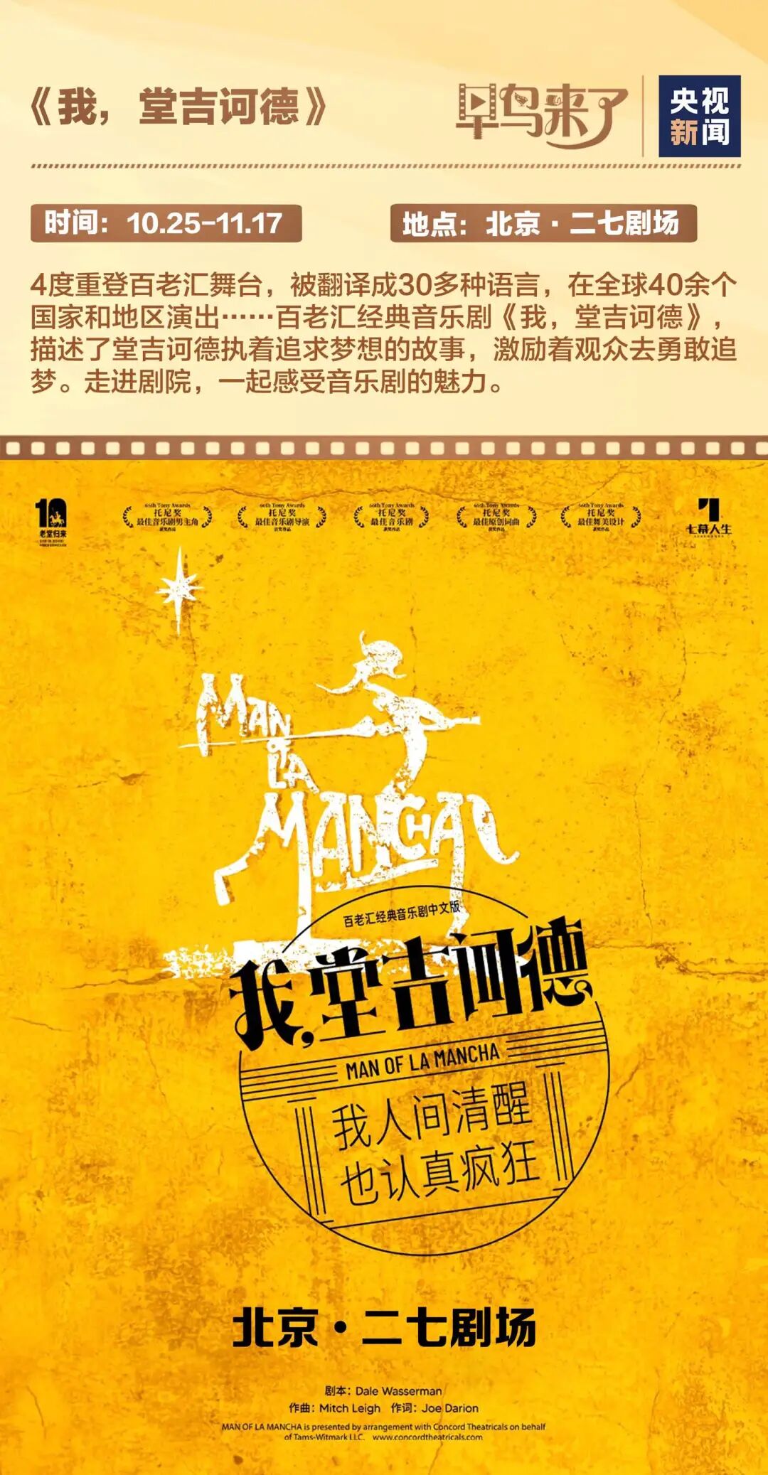 四度重登百老汇舞台,被翻译成30多种语言,在全球40余个国家和地区演出……百老汇经典音乐剧《我,堂吉诃德》25日开演,演员们生动展现了堂吉诃德追逐梦想的勇敢与执着。走进剧场,在笑与泪中感受梦想的力量!