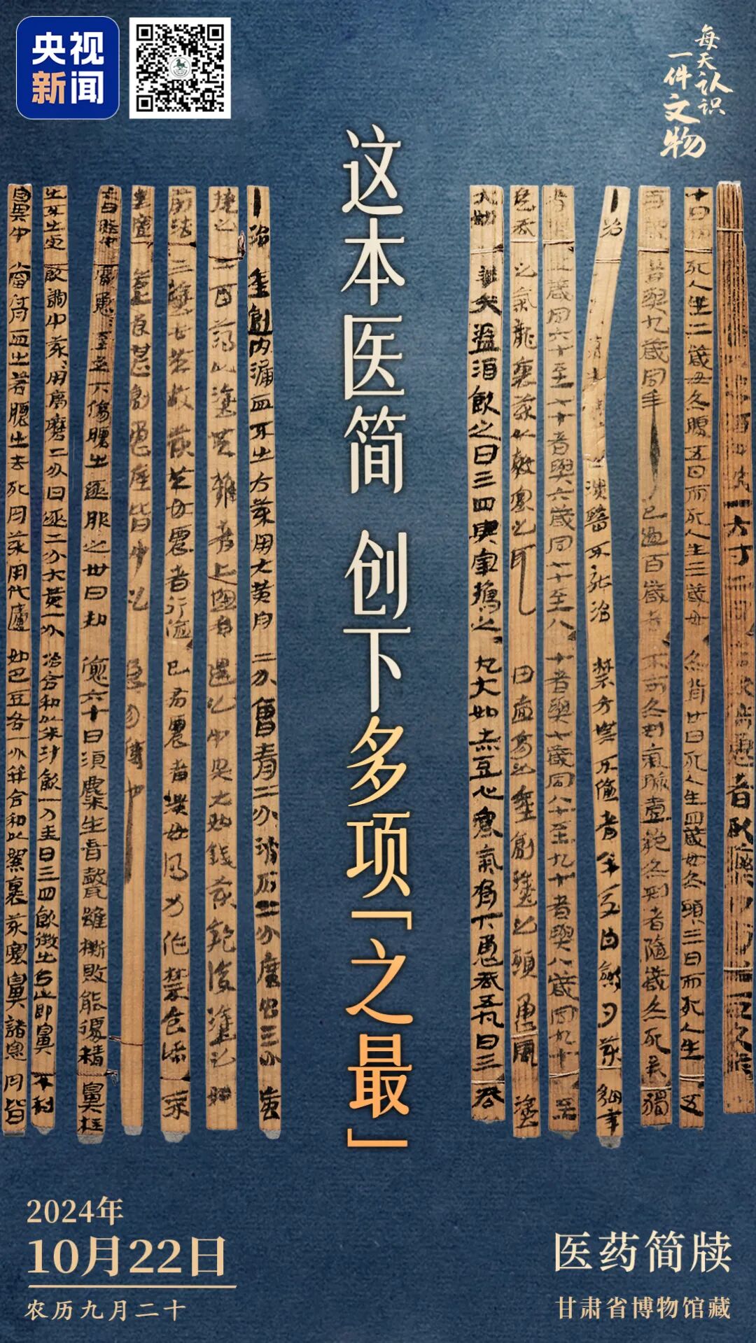 央视新闻联合全国博物馆推出文博科普产品《文博日历》,每天带你认识一件文物。出土于甘肃武威的《医药简牍》是我国时代最早、内容最多的医学著作原始文献,记录了“治风寒逐风方”等30多个较为完整的医方,涉及内科、外科、妇科、五官科、针灸科等,所列药物近100味,创下了中国医学多项“之最”。长按识别图中二维码查看详情↓