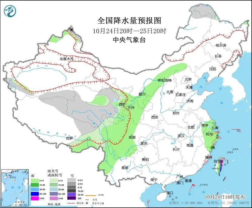 中央气象台预计,24日20时至25日20时,新疆阿勒泰山区和南疆南部山区、西藏北部和东部、青海东部和中南部、内蒙古东北部、黑龙江西北部等地部分地区有小雪或雨夹雪,其中,新疆阿勒泰山区部分地区有中到大雪。浙江南部沿海、福建东北部沿海、台湾岛等地部分地区有中到大雨。