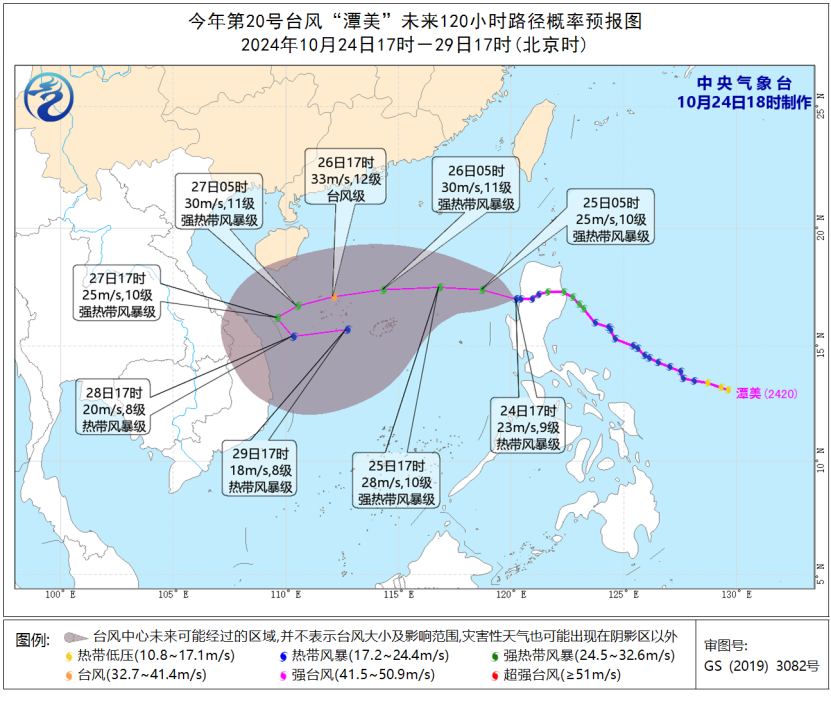 中央气象台24日18时继续发布台风蓝色预警,预计今年第20号台风“潭美”将于24日夜间移入南海东部海面。受“潭美”与冷空气共同影响,24日20时至25日20时,东海大部海域、台湾海峡、南海北部和中部海域将有7~9级、阵风10~11级大风。