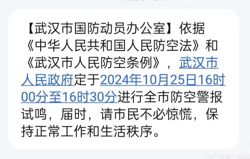 这两天,不少人收到了短信提醒,武汉全市防空警报试鸣期间,请市民不必惊慌,保持正常工作和生活秩序。