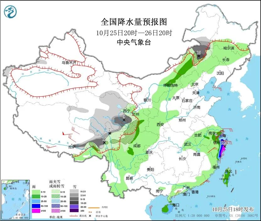 中央气象台预计,25日20时至26日20时,内蒙古中东部、西藏东部、青海东部、甘肃中西部、川西高原等地部分地区有小到中雪或雨夹雪,其中,内蒙古东南部、西藏东南部、青海东部等地部分地区有大到暴雪。内蒙古中东部、甘肃西南部、四川盆地西南部、上海、浙江东部、福建东北部、海南岛、台湾岛等地部分地区有中到大雨,其中,浙江东部等地部分地区有暴雨或大暴雨。