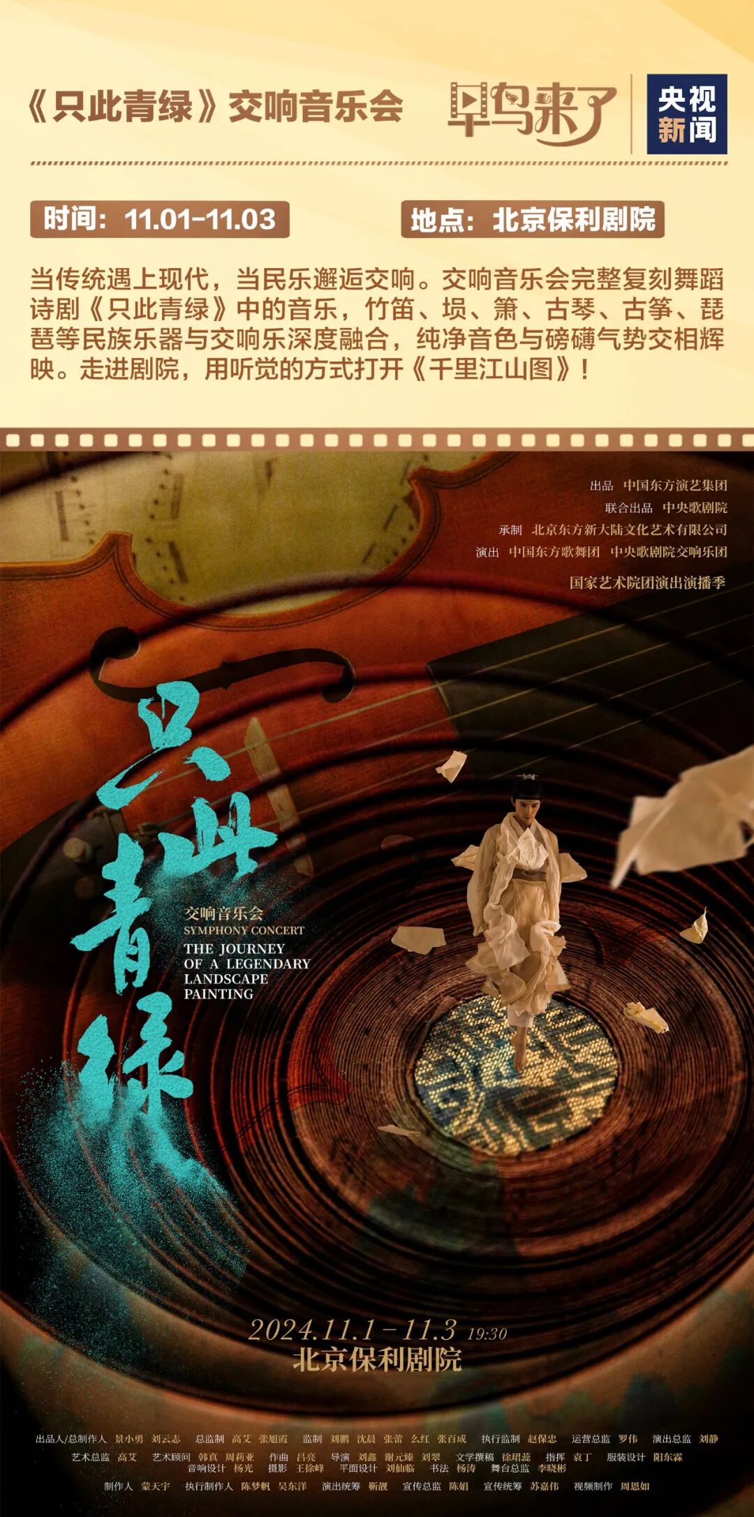当传统遇上现代,当民乐邂逅交响。11月1日至3日,《只此青绿》交响音乐会在北京保利剧院奏响。这场音乐会将完整复刻舞蹈诗剧《只此青绿》中的音乐,竹笛、埙、箫、古琴、古筝、琵琶等民族乐器与交响乐深度融合,纯净音色与磅礴气势交相辉映。走进剧院,感受青绿里的中华之韵!