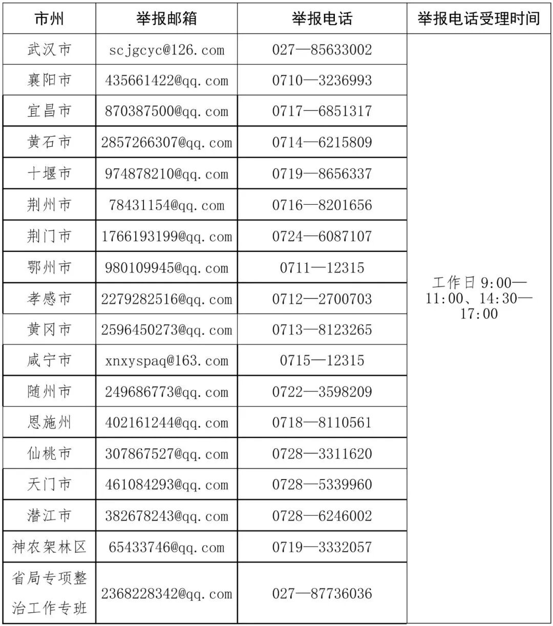湖北省市场监管局日前发布《关于公示纵深推进中小学校园食品安全突出问题专项整治举报邮箱和电话的公告》。欢迎社会公众围绕中小学食堂是否存在硬件设施不达标、食品安全制度不落实、大宗食材采购管理不严格、环境卫生不整洁等重点问题进行举报监督。黄冈举报电话0713-8123265,举报邮箱2596450273@qq.com。