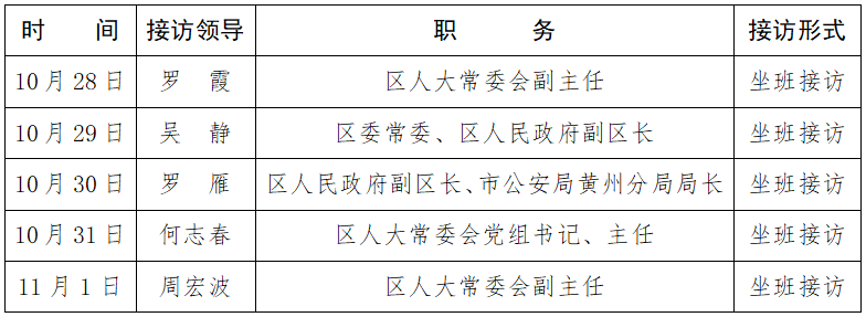 为深入践行党的群众路线,加强和改进人民信访工作,进一步畅通信访渠道,依法及时就地解决群众合理诉求,根据工作安排,现将10月28日至11月1日黄州区领导接访安排公示如下: