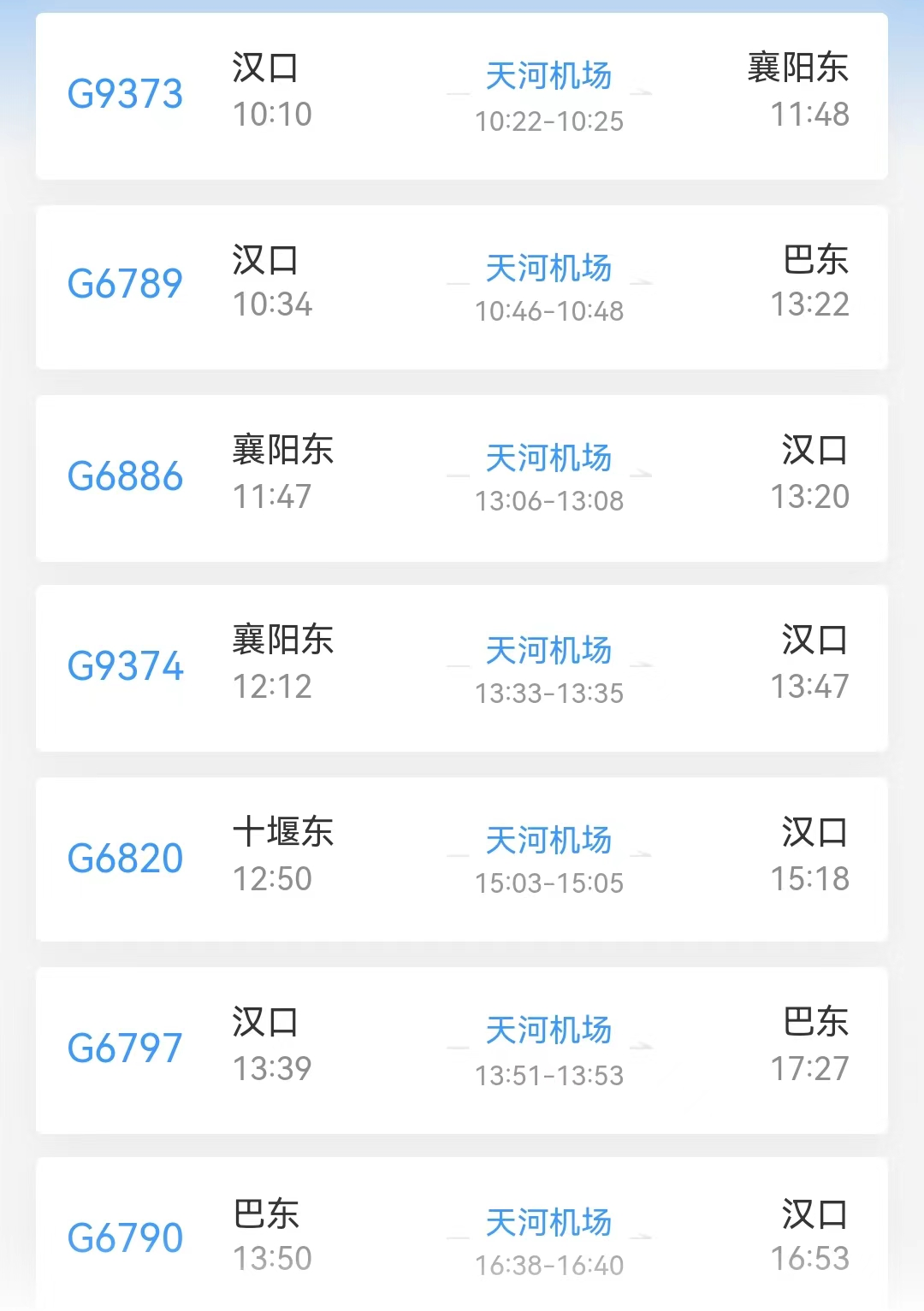 从武汉市外的咸宁南、云梦东、仙桃西、孝感东、襄阳东、随州南、黄冈东、宜昌东等车站,也可以直达天河机场。
