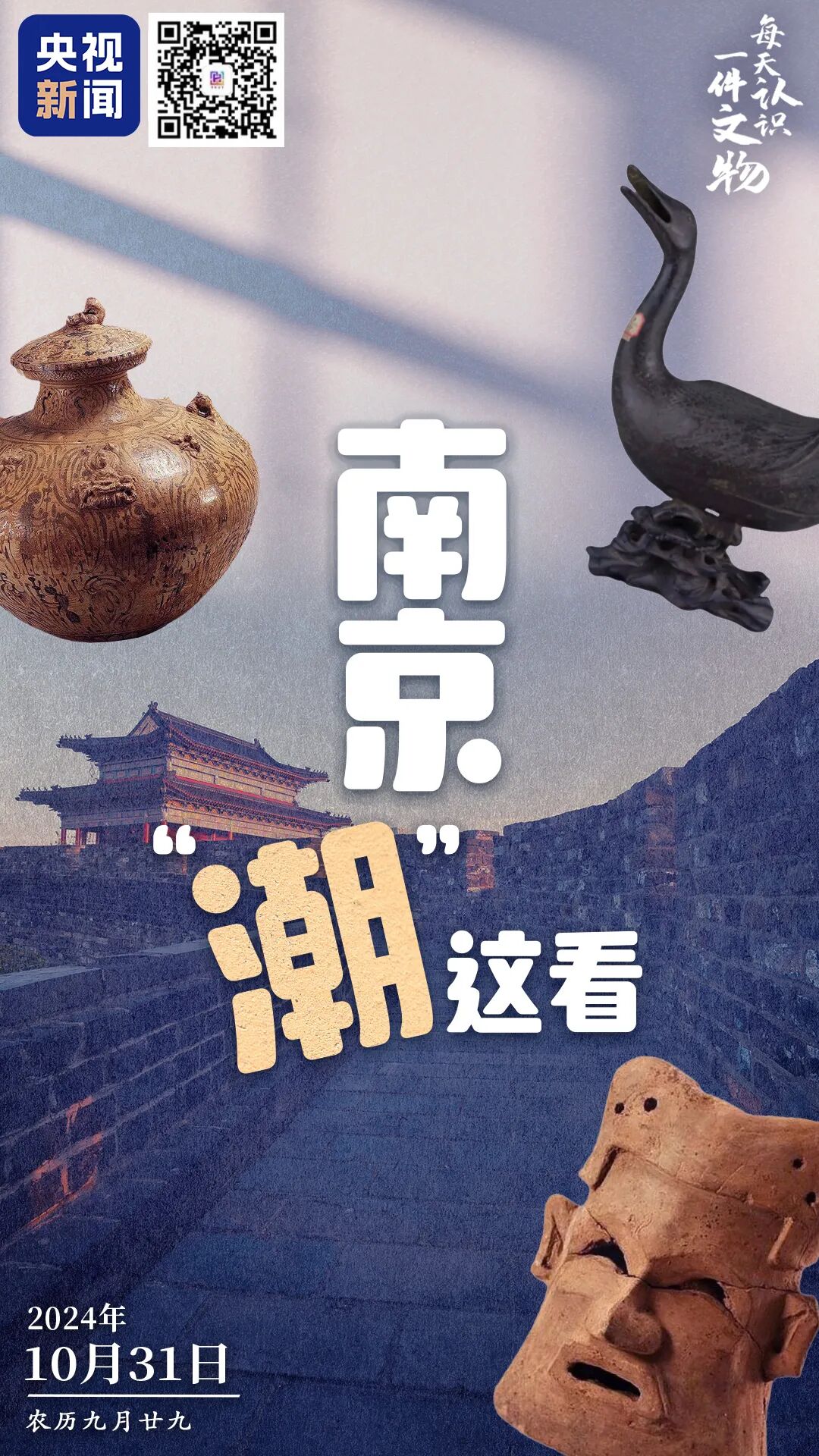 央视新闻联合全国博物馆推出文博科普产品《文博日历》,每天带你认识一件文物。作为“六朝古都”,南京全市共有80座备案博物馆,有着“博物馆之城”的美誉。南京市博物馆总馆的陶塑⼈⾯像、六朝博物馆的⻘瓷釉下彩⽻⼈纹盘⼝壶、南京博物院的明铜鸭出⾹……一件件文物将南京的历史文化积淀展露无遗。