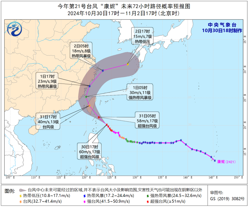 中央气象台30日18时发布台风橙色预警,预计今年第21号台风“康妮”将于31日中午前后在台湾岛东部沿海登陆。受台风“康妮”和冷空气的共同影响,30日20时至31日20时,浙江东部、福建东北部等地部分地区有大到暴雨,台湾岛大部有暴雨或大暴雨,其中台湾岛东部部分地区有特大暴雨。