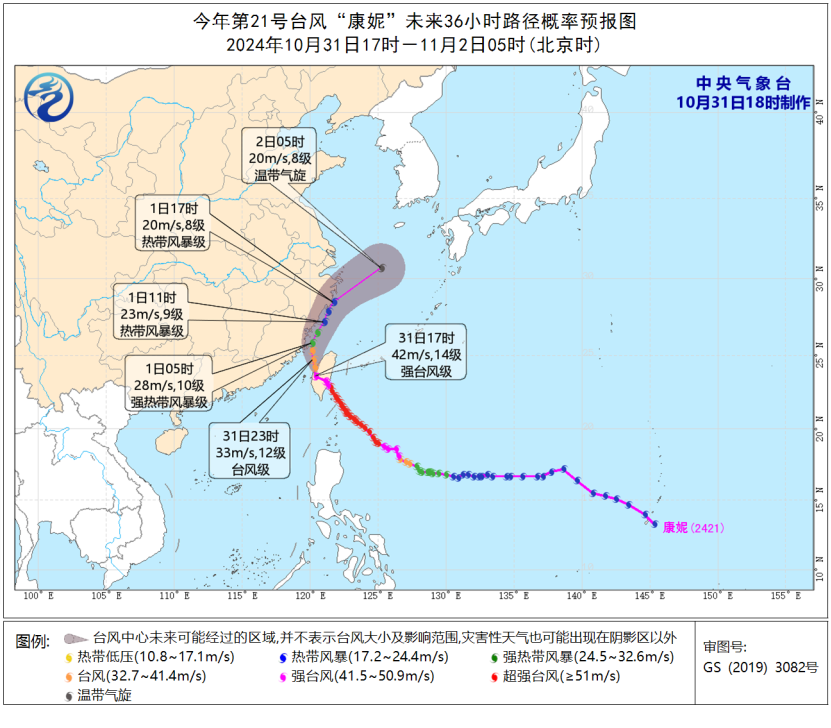 中央气象台10月31日18时继续发布台风橙色预警:今年第21号台风“康妮”已穿过台湾岛进入台湾海峡,预计“康妮”将于今天(11月1日)夜间在浙江近海开始转向东北方向移动,并在东海北部逐渐变性为温带气旋。仍不排除“康妮”登陆福建和浙江沿海的可能性。