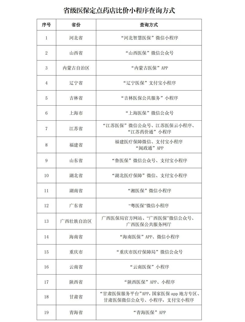 今年7月份以来,已有19个省(自治区、直辖市)以及浙江杭州等地市陆续推出覆盖全省或全市的定点药店比价小程序,群众可通过当地医保局App、微信小程序等途径获取药品比价。