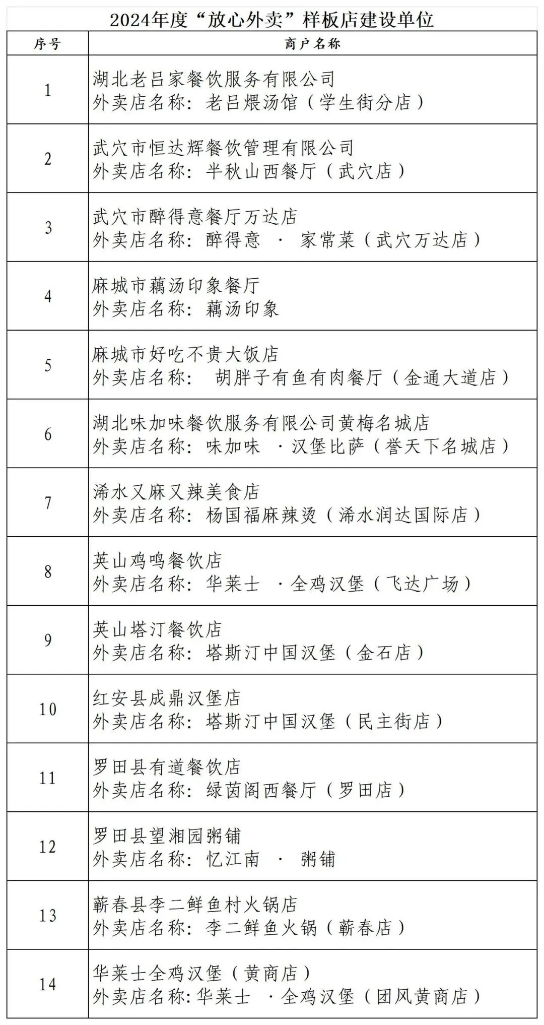 近日,湖北省食品安全协会网络餐饮专业委员会评价公布入网餐饮服务经营者“放心外卖”样板店名单,黄冈14家餐饮店上榜。