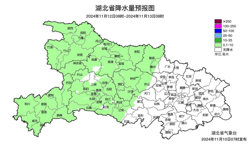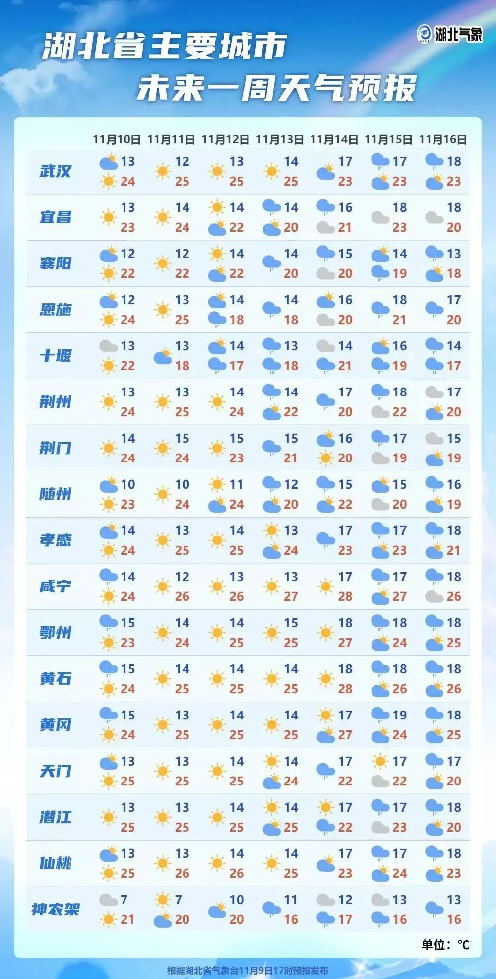 11月12日08时-13日08时,鄂西北、鄂西南多云到阴天有小雨;鄂东北西部、江汉平原西部多云转小雨;其他地区多云。最高气温西部19~22℃、中东部22~26℃,最低气温 12~15℃,偏北风2到3级。