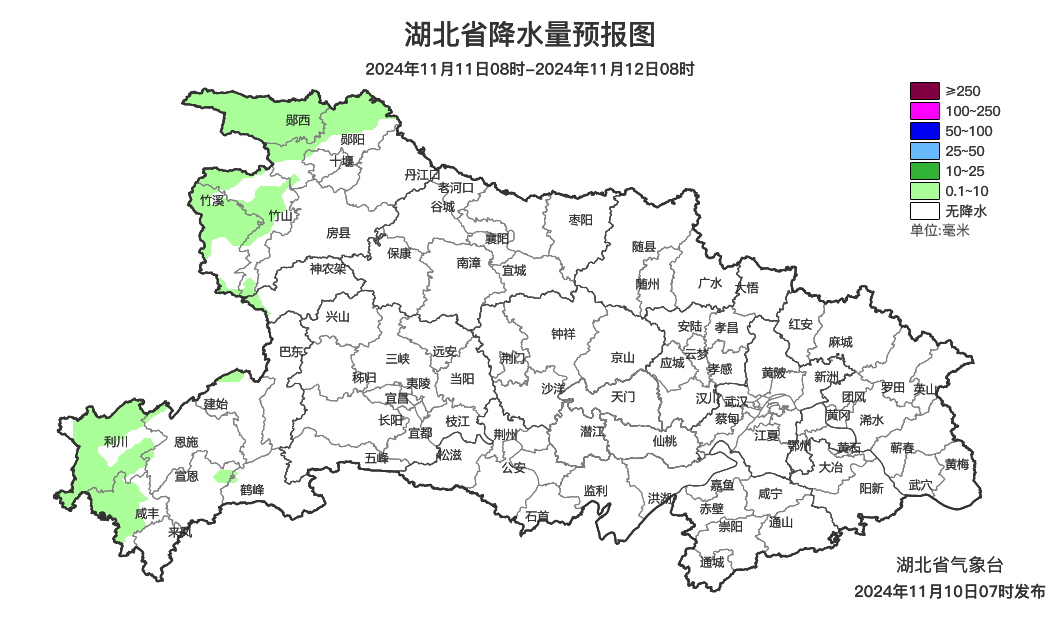 11月11日08时-12日08时,全省晴天到多云,其中鄂西北、鄂西南晚上局地有小雨。最高气温鄂西北18~23℃、其他地区23~26℃,最低气温11~14℃,偏北风2到3级。