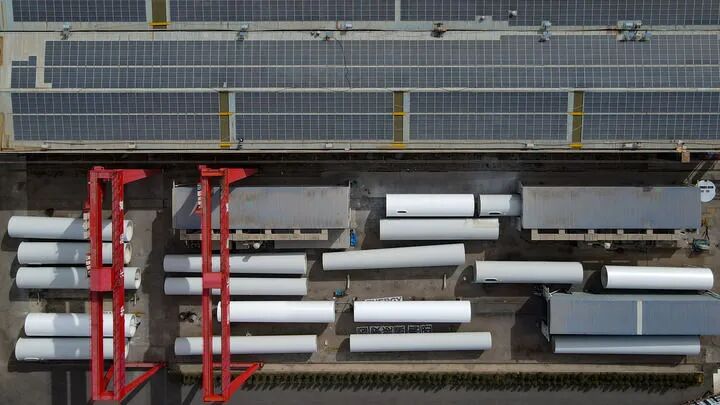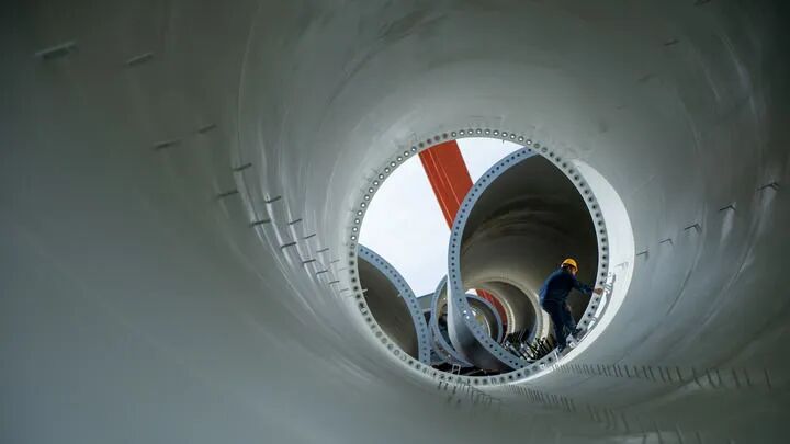 青海华汇新能源有限公司塔筒车间工人在检查塔筒(10月10日摄)。新华社发(潘彬彬 摄)