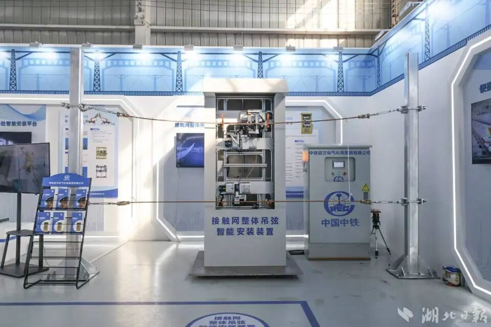 在中铁武汉电气化局智能工作站,现场人员介绍,荆荆高铁上成功应用了该局全国首创的接触网腕臂/吊柱和吊弦智能安装装置两大“神器”。