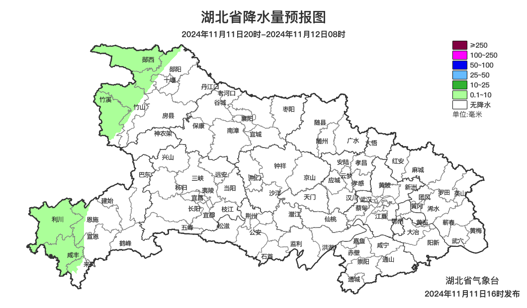11月11日20时——11月12日08时,鄂西北、鄂西南多云,局地有小雨;其他地区晴天到多云。最低气温12℃~16℃,偏北风2到3级。