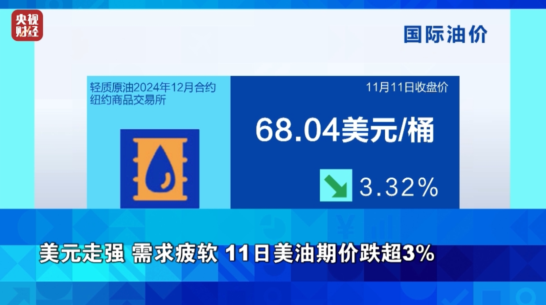 周一,国际油价显著下跌,纽约商品交易所12月交货的轻质原油期货价格收于每桶68.04美元,跌幅为3.32%;2025年1月交货的伦敦布伦特原油期货价格收于每桶71.83美元,跌幅为2.76%。油价下跌一方面是当天美元走强,降低了以美元计价的原油吸引力;此外在供需端,市场预期未来原油市场仍将呈现供过于求的局面。美国银行周一在一份说明中表示,预计2025年非欧佩克原油供应量将每天增长140万桶,2026年每天增长90万桶,而需求端的疲软将使国际油价未来走势承压。