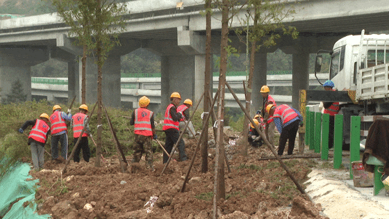 在郧西南枢纽互通,正在进行道路绿化和交通安全设施的收尾施工,一部分施工人员在栽种水杉,绿化道路,另外一部分施工人员正在路面施划标识标线。