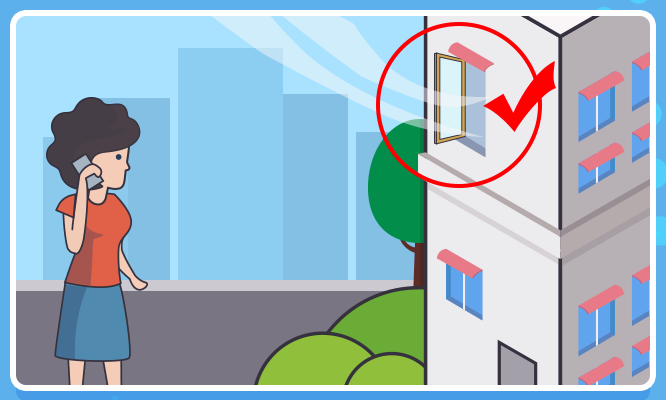 关闭燃气阀、开窗通风后,需立即转移至室外安全的地方打电话报警或拨打当地燃气抢修电话求救,耐心等待专业人员过来处理问题。