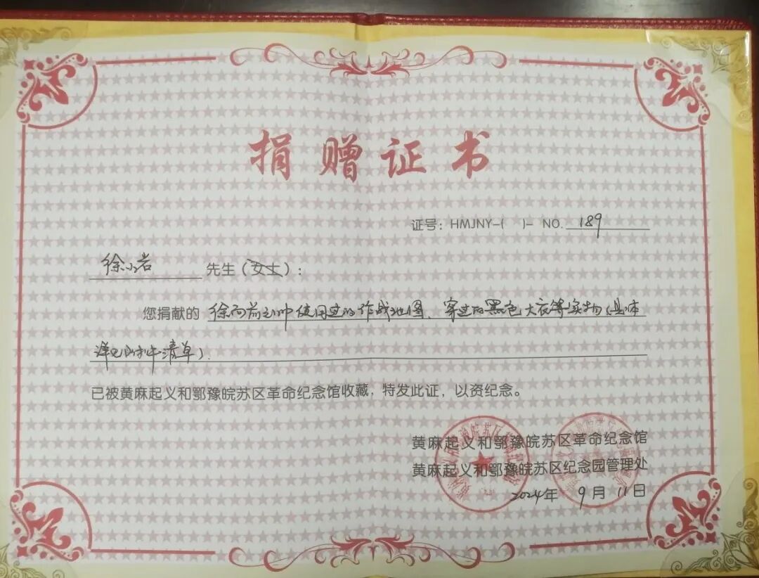 在黄麻起义胜利97周年和红四方面军诞生93周年之际,徐向前元帅之子、解放军原总装备部科技委员会副主任徐小岩中将向黄麻起义和鄂豫皖苏区纪念馆捐献了150余件徐向前元帅生前使用的物品。