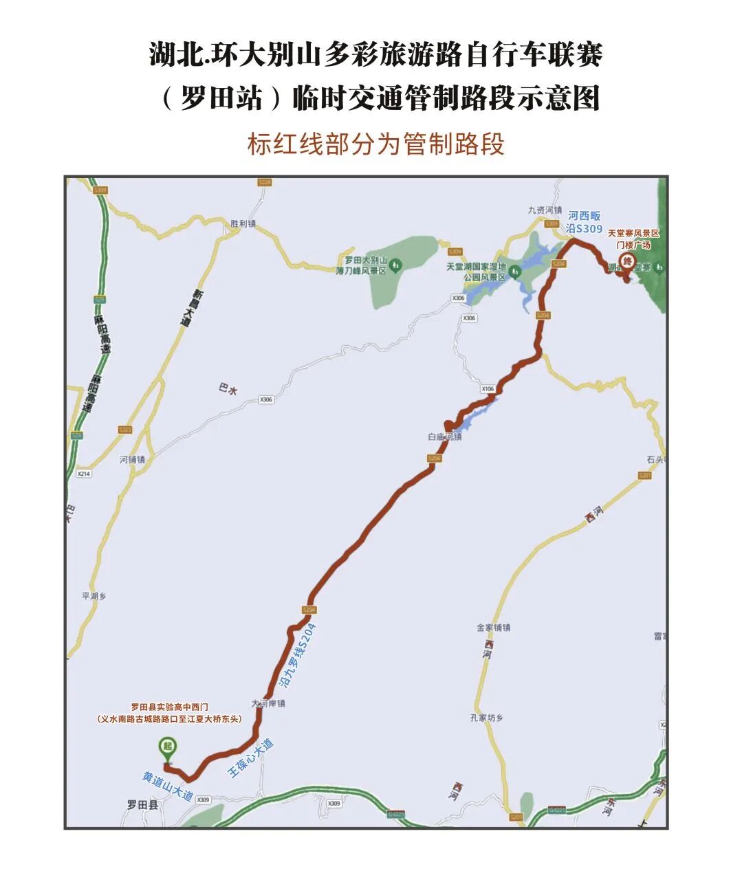 起点:罗田县实验高中西门(义水南路古城路路口至江夏大桥东头)—凤山镇(黄道山大道、王葆心大道)—大河岸镇(沿九罗线S204)—白庙河镇—九资河镇(河西畈,沿S309)—终点:天堂寨风景区门楼广场。(全程60㎞)