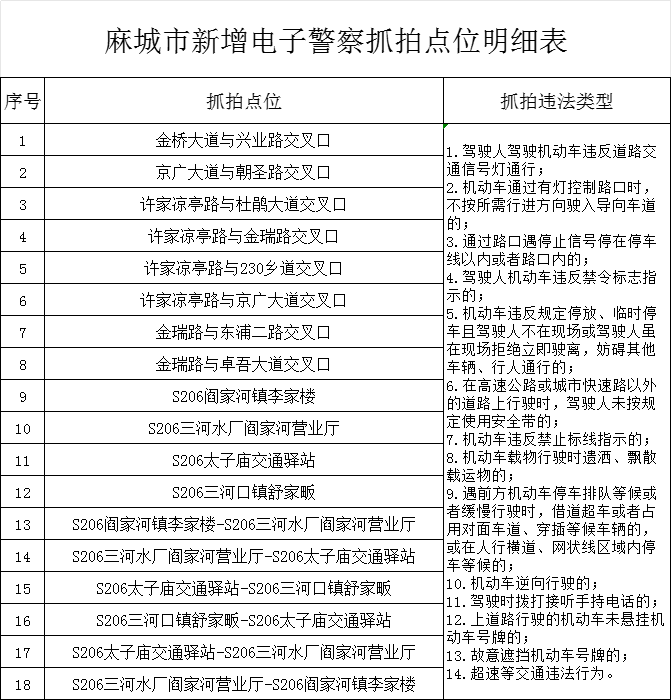 自2025年1月1日起,在麻城市区域内的部分路口、路段新增启用电子警察交通违法抓拍系统,针对驾驶人驾驶机动车违反道路交通信号灯通行、违反禁令标志、违反禁止标线指示、逆向行驶、不按导向行驶、超速行驶等交通违法行为,进行自动抓拍并依法处理。