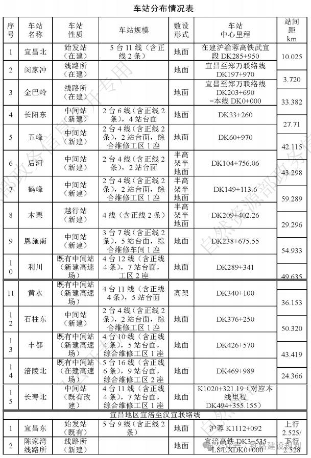 全线共设长阳东、五峰、后河、木栗(越行)、鹤峰、恩施南、利川(既有)、黄水(既有)、石柱东、丰都(既有)、涪陵北(既有)、长寿北(既有)等12个车站。